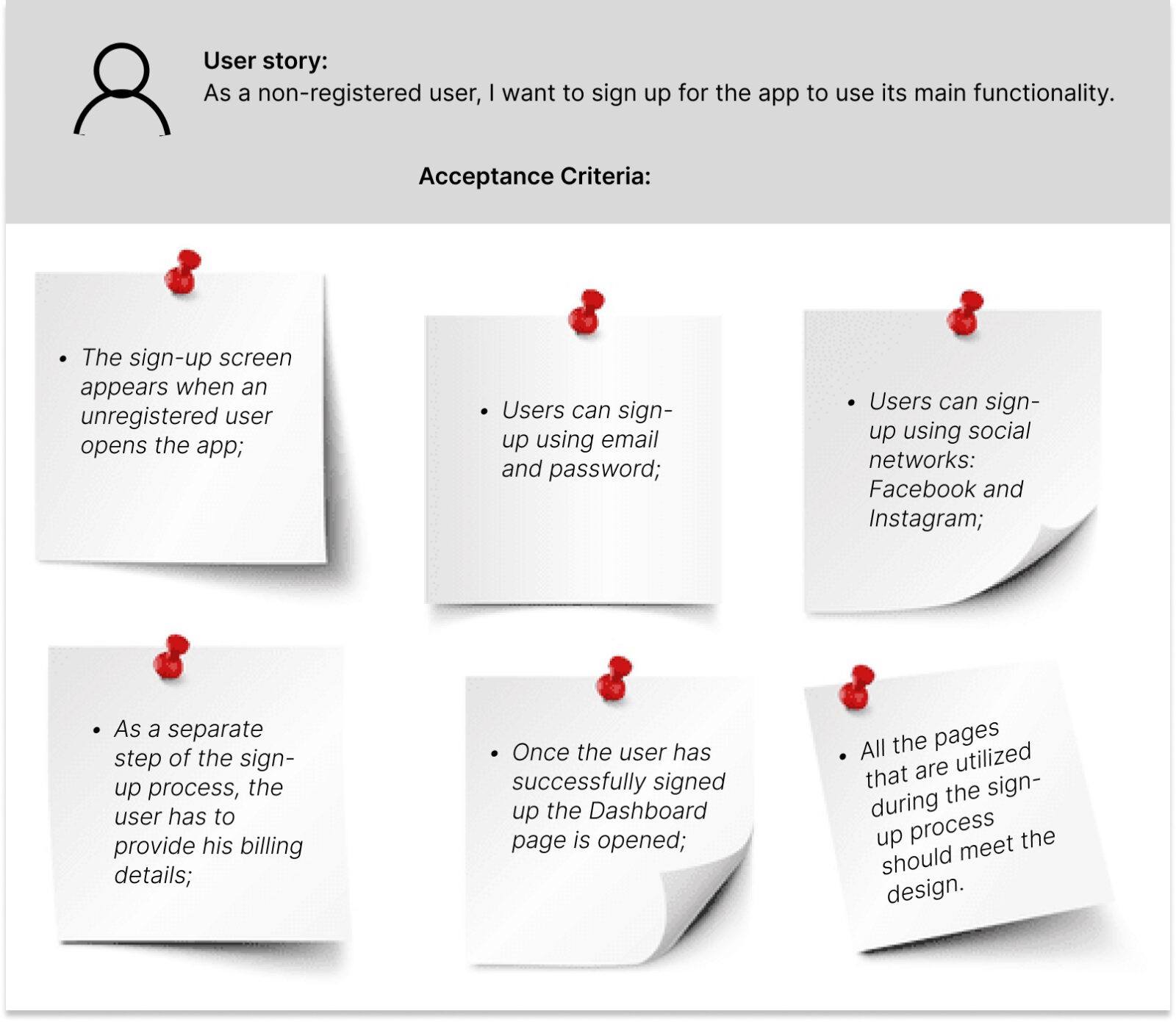 All the requirements gathered during the discovery phase are outlined in the form of User Stories that are understandable for both: the client and the development team. Each User Story is followed by a List of Acceptance Criteria that includes specific information on how it should be implemented.